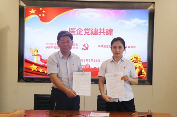 为深入学习贯彻习近平新时代中国特色社会主义思想主题教育,有力推进支部建设,体现员工关爱,切实发挥“党建带关建”作用,开拓构建“资源共享、优势互补、互相促进、共同提高”的党建工作新格局。6月28日,我司党支部与浙江骨伤医院党总支开展党建结对共建活动,公司党支部书记蔡红伟与医院党总支副书记王雅萍进行了签约。